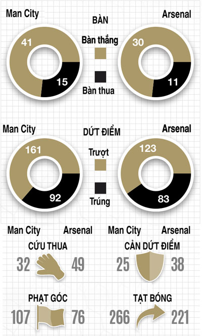 Thống kê chuyên môn Man City - Arsenal (* - Tính sau 15 trận Premier League mùa này) ĐƯỜNG XA MỎI GỐI So với các CLB hàng đầu tại Premier League bây chừ.